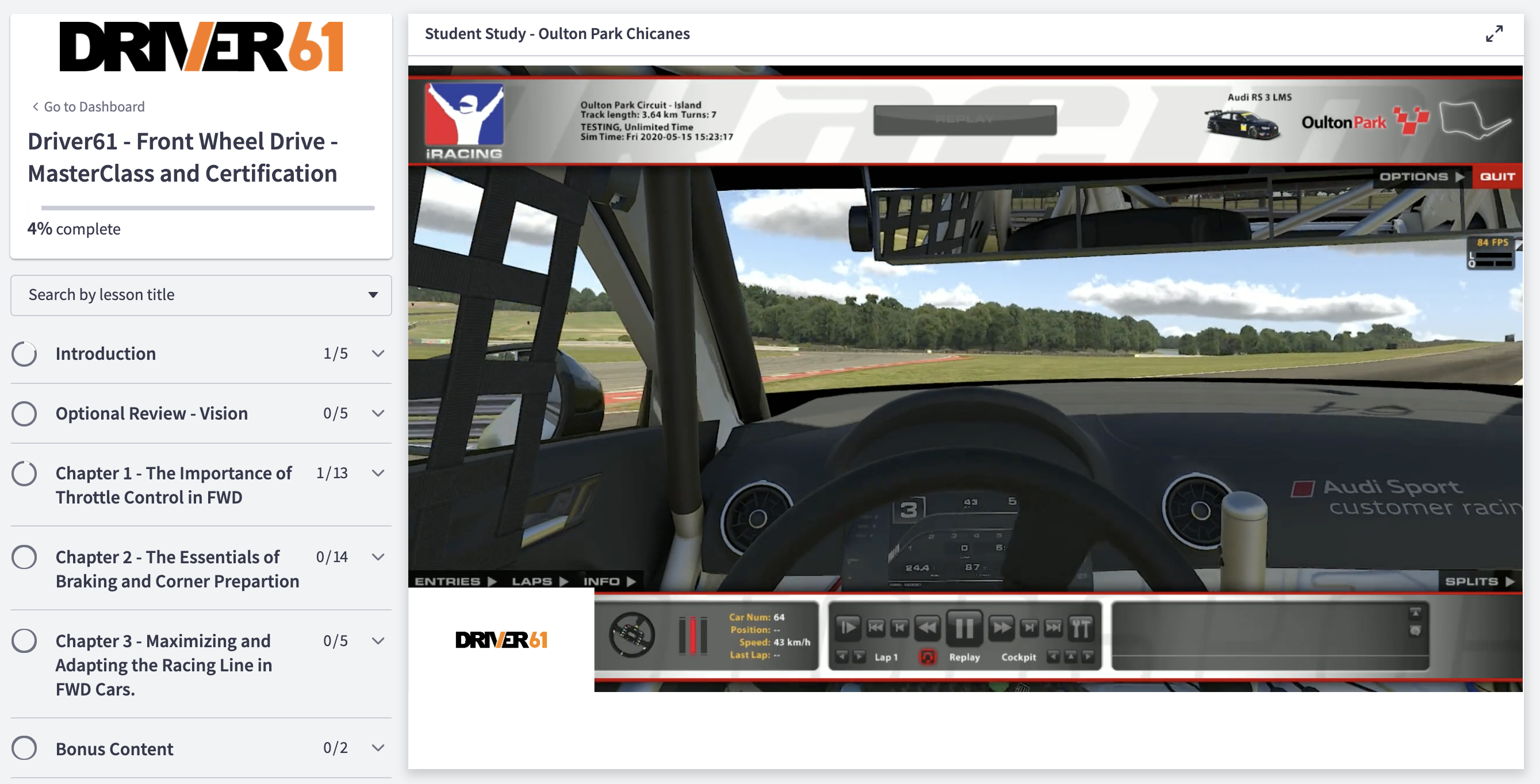 - 10+ hours of Driver61 designed exercises on Ovals and Road Tracks.**