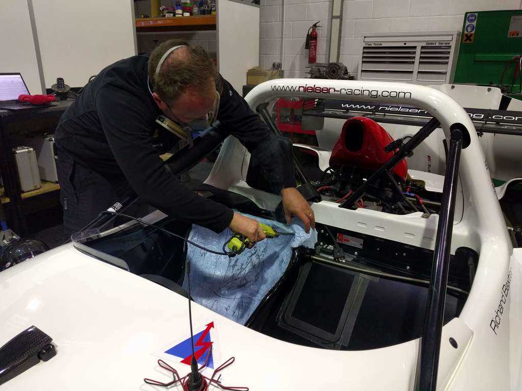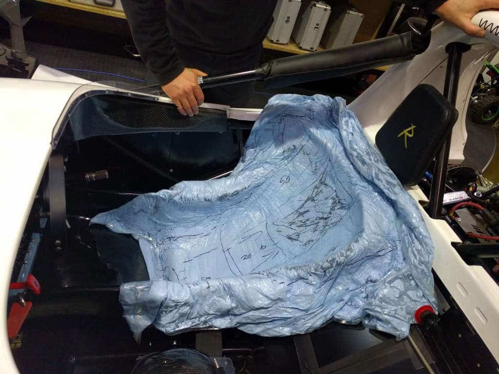 The seat fit is a two stage process. We do a dry fit, with no resin. Once you’ve got the beads where you want them and the driver is comfortable, the driver gets out, you remove the bag from the shell, add the resin, mix and the re-run what you’ve just done to get the seat how the driver wanted it.