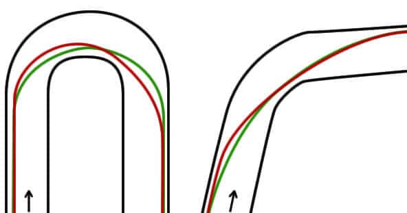 With the geometric line, you can gain a few mph on entry, for let’s say 100m. The ideal racing line will loose a little on entry, but you’ll gain a few mph for, let’s say 500m, down the next straight – resulting in a larger win in lap time.