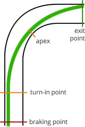 From the braking point, through turn-in, apex (clipping point) and exit, the racing line is critical to lap time.