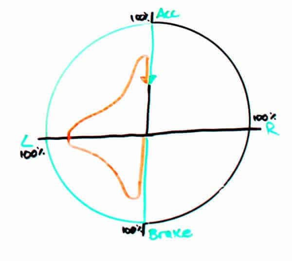 On the traction circle diagram below we can see a comparison of a professional (green) and amateur (red) drivers use of grip.