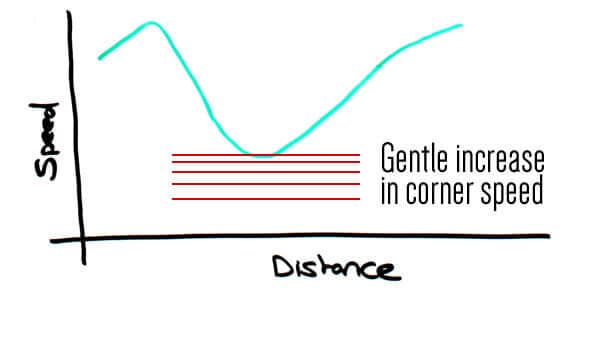 Take a look at the diagram below which shows a typical speed v distance trace for a corner where the car slows, turns and then accelerates again. This trace shows the fastest possible route through the corner in question.