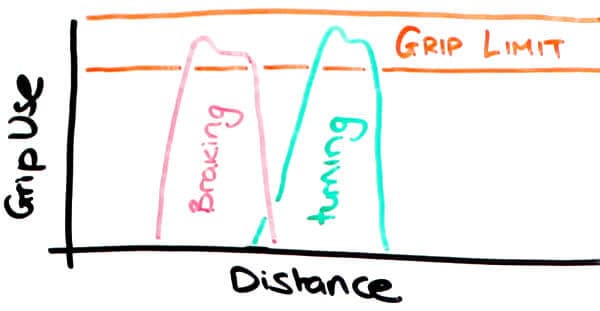 One important thing to understand is that if a tyres grip is used at 100% of it’s potential in one direction – e.g., braking – not even 1% of it can be used to turn. The diagram below explains that you must give up some braking grip in order to turn.