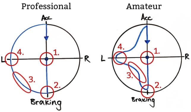 - The amateur driver releases the brakes more when in a straight line and then begins to turn into the corner. As you can see there is more grip available to both decelerate and turn.