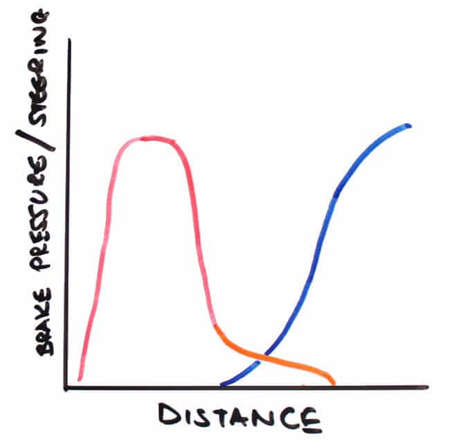 Just before the apex the driver should be completely off the brakes and the tyre’s grip will be wholly used for cornering, with no grip used for deceleration.