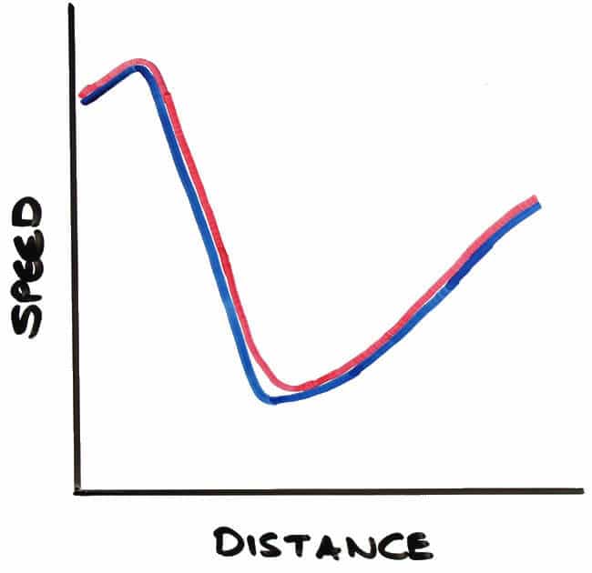 As you can see the red line carries much more speed to the apex, whereas the blue line does not manipulate balance advantageously. It’s most likely that the car represented by the blue line is oversteering on entry to the corner – due to too much trail braking.