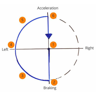 - Begin to open up the steering angle – as just described with the G-circle, we must open the radius of the corner up, to allows us to transfer some grip from cornering to begin acceleration.