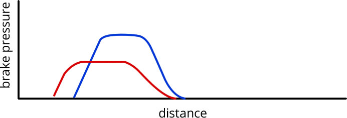 The graph below shows a comparison of speed vs. distance for two drivers; red and blue. As you can, both drivers begin braking at the same time and initially decelerate at the same rate.