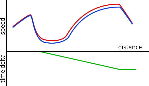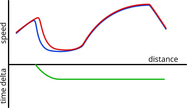 The time delta loss here shows an initial spike – the difference in ultimate braking points, but then it levels off as the blue driver manages to complete the rest of the corner optimally.