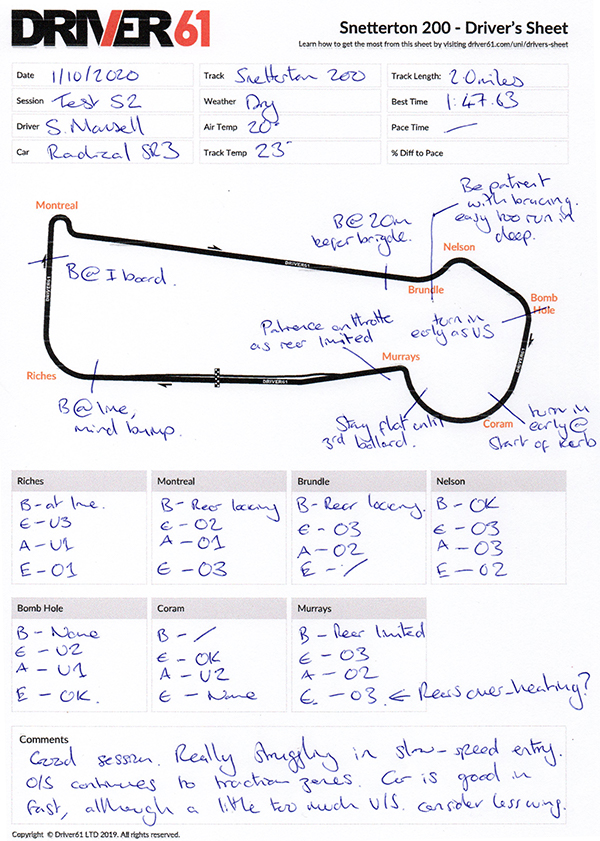 When you structure your track map feedback sheets in this way, you’ll be able to begin to make logical changes to your technique or setup, based on proper feedback.