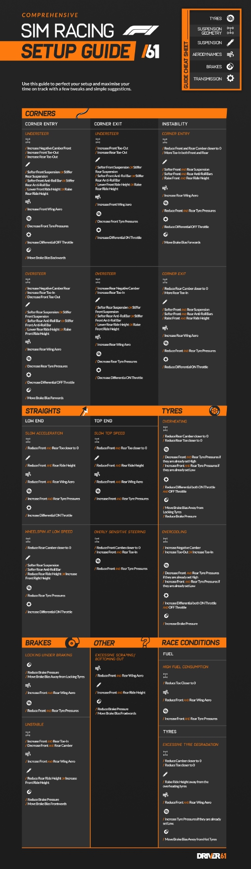 The guide aims to educate on what setup changes affect how the car handles. By determining issues with the car’s handling on track, you can follow the necessary setup advice to eradicate/improve certain aspects of the car.
