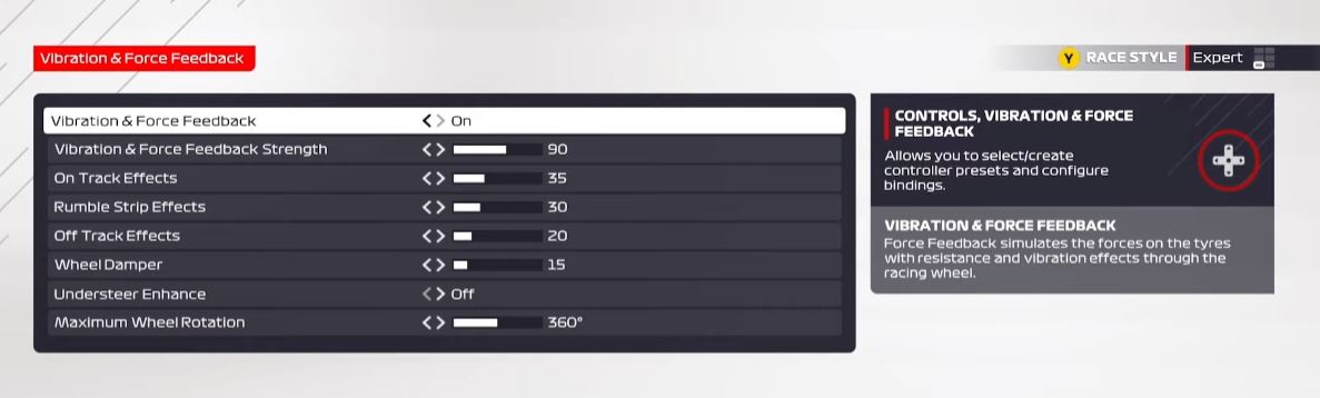 Go out on track in a practice session and use a circuit you are familiar with. Take time to get used to the new settings before making personal adjustments to FFB. Main adjustments to consider: Vibration & FFB Strength, Understeer Enhance and On Track Effects.