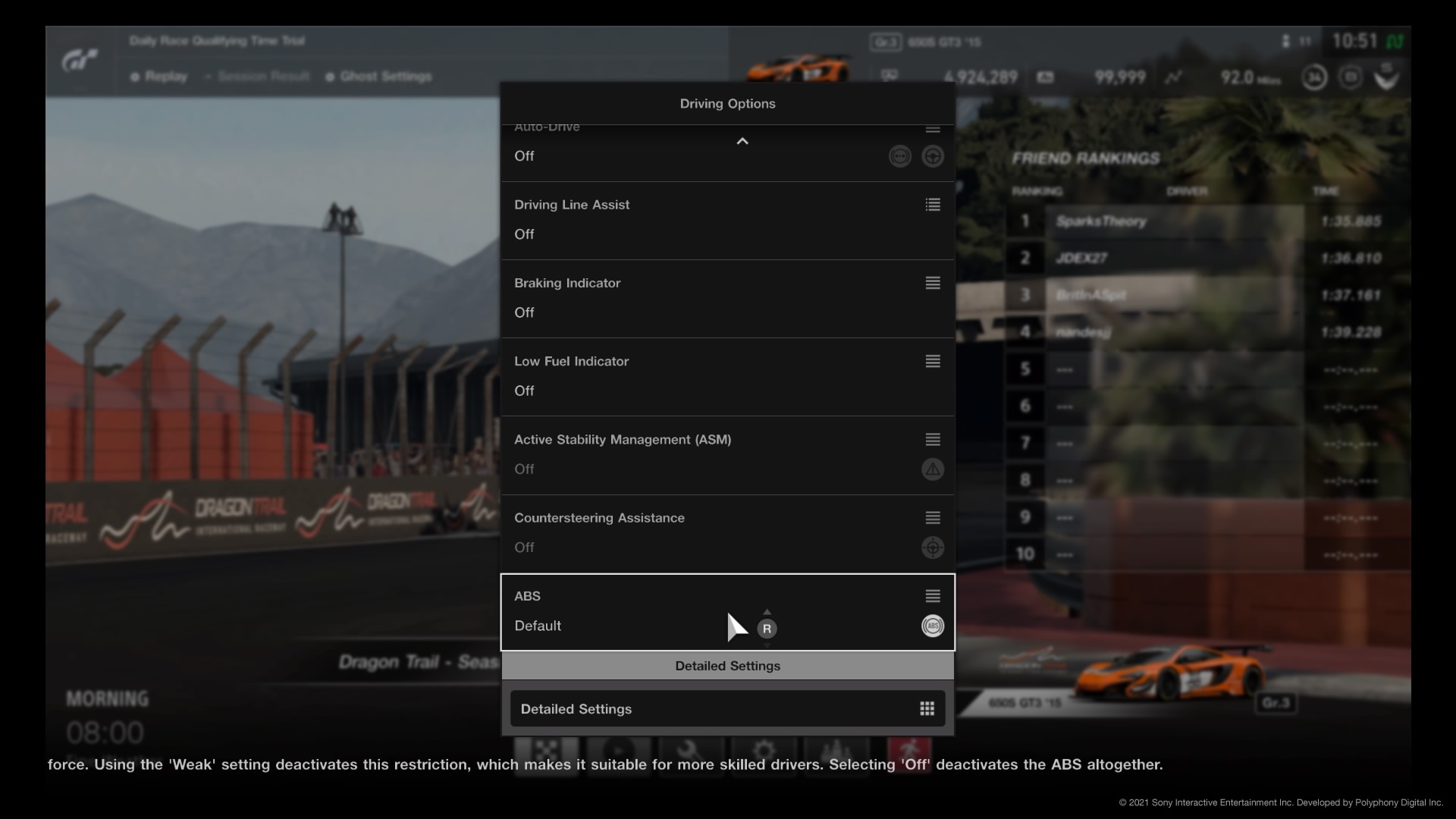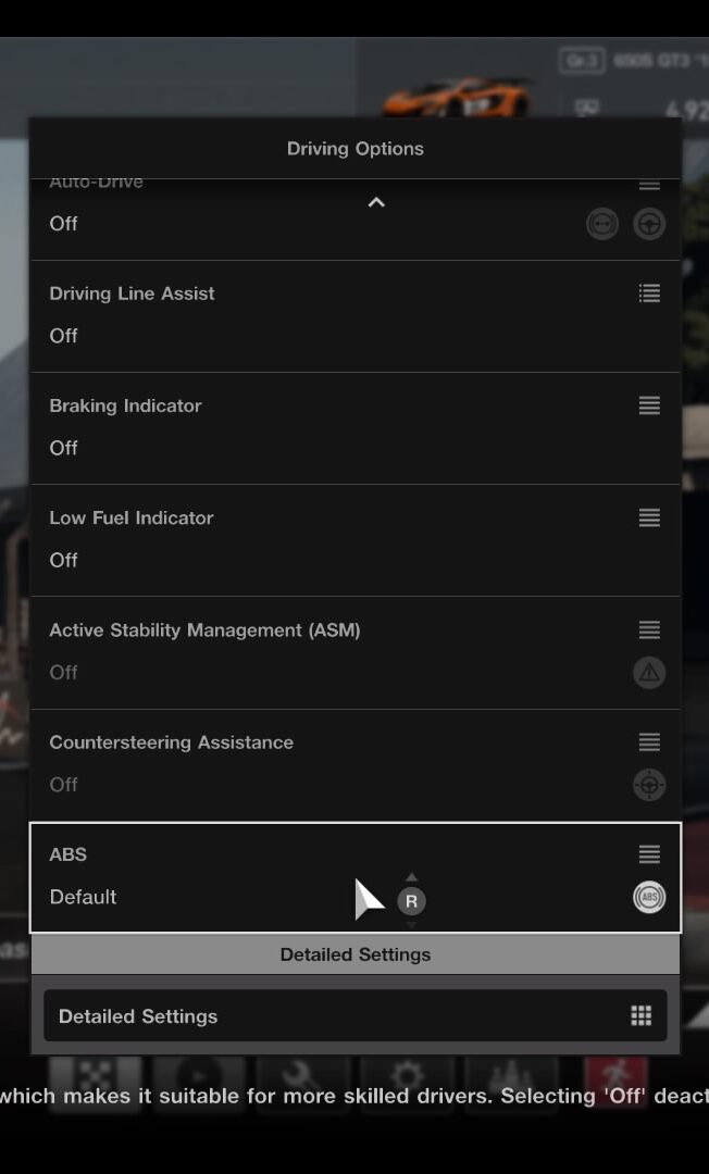 Similarly to Traction Control, one of GT Sports available driving assists is ABS. ABS stands for; Anti-lock Braking System.