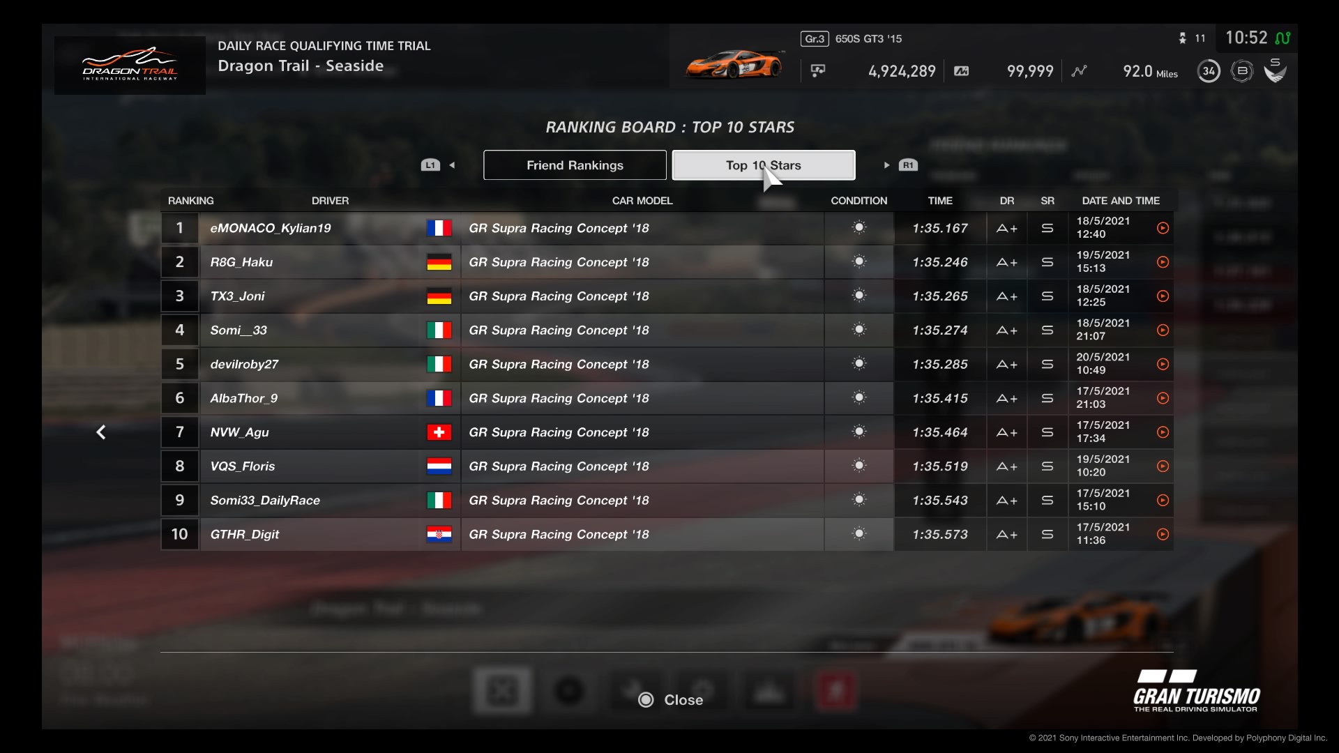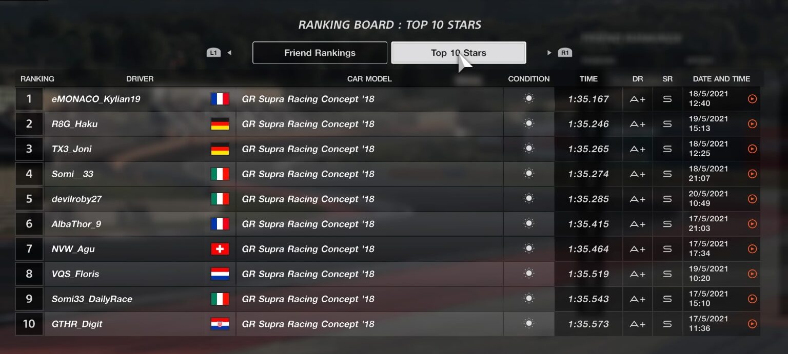 One of the best features in GTS is the ability to watch the Top 10 fastest replays. These clips are available in any of the online Sport modes for both the daily races and FIA events.